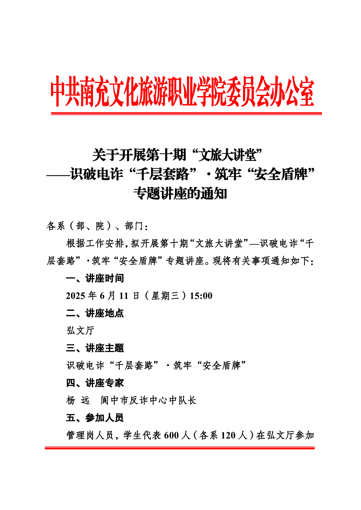 第十期 关于开展第十期“文旅大讲堂”--识破电诈“千层套路”·筑牢“安全盾牌”专题讲座的通知
