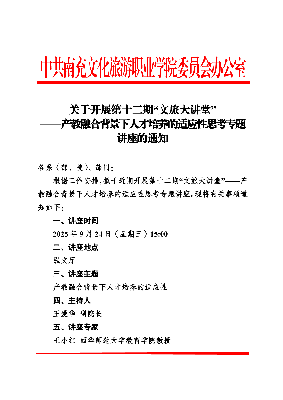 关于开展第十二期“文旅大讲堂”——产教融合背景下人才培养的适应性思考专题讲座的通知