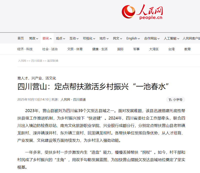 2023年,营山县被列为四川省39个欠发达县域之一。面对发展难题,该县迅速搭建托底性帮扶县级工作推进机制,为乡村振兴按下“快进键”。2024年,四川省委社会工作部牵头,联合四川出入境边防检查总站、南充文化旅游职业学院、兴业银行成都分行,分别定点帮扶营山县老林镇龙跃村、渌井镇渌井村、东升镇三官村、回龙镇龙坝村。各帮扶单位发挥自身优势,从人才培育、产业发展、文化建设等方面持续发力,为乡村注入强劲动能。