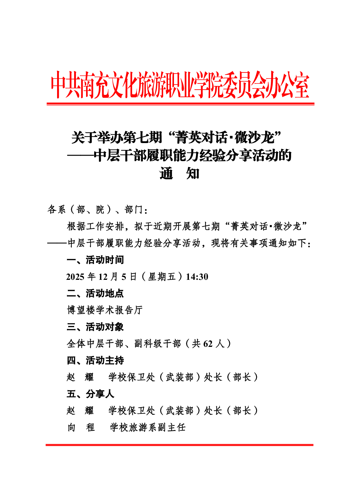 关于举办第七期“菁英对话・微沙龙”——中层干部履职能力经验分享活动的通知
