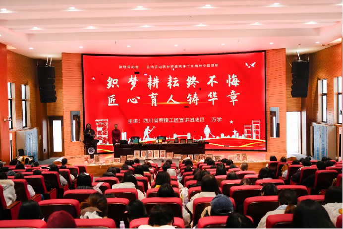 为深入学习贯彻习近平总书记在庆祝中华全国总工会成立100周年暨全国劳动模范和先进工作者表彰大会上的重要讲话精神,大力弘扬劳模精神、劳动精神、工匠精神,充分发挥先进典型的示范引领作用,引导师生树立正确的劳动观和职业观,12月23日下午,我校举办第十六期文旅大讲堂“劳模工匠进校园”专题讲座,讲座邀请到四川省劳动模范、全国乡村工匠名师万学到校宣讲。我校各系教师、学生代表200余人参会。