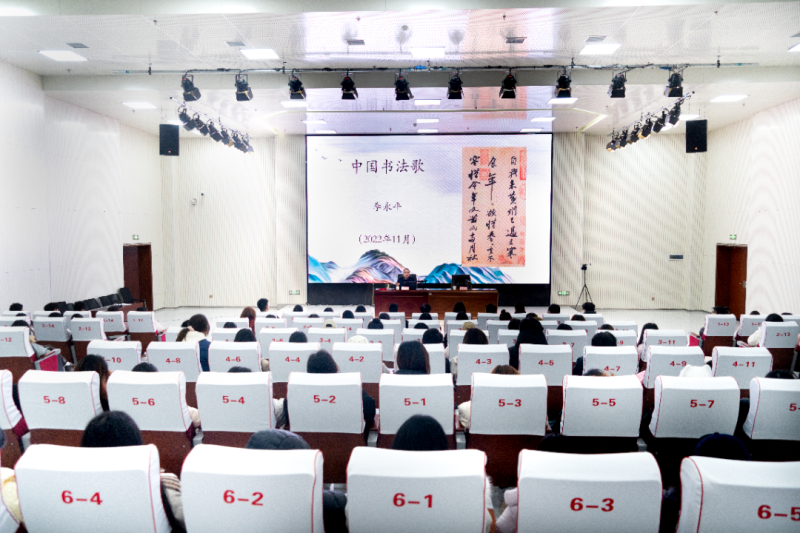 讲座中,李永平以“从《中国书法歌》一诗看中国书法历史和源流演变”为主题展开分享。他以自作诗《中国书法歌》为脉络,从甲骨文、金文的古朴神秘,到篆隶的庄重典雅,再到楷行草的灵动多变,系统梳理了中国书法数千年的源流演变历程,结合历代名家典故与经典碑帖赏析,深入浅出地解读了书法艺术的审美特质与文化内涵,让现场师生在墨香氤氲中领略中华传统文化的博大精深,感受汉字背后蕴含的精神力量。