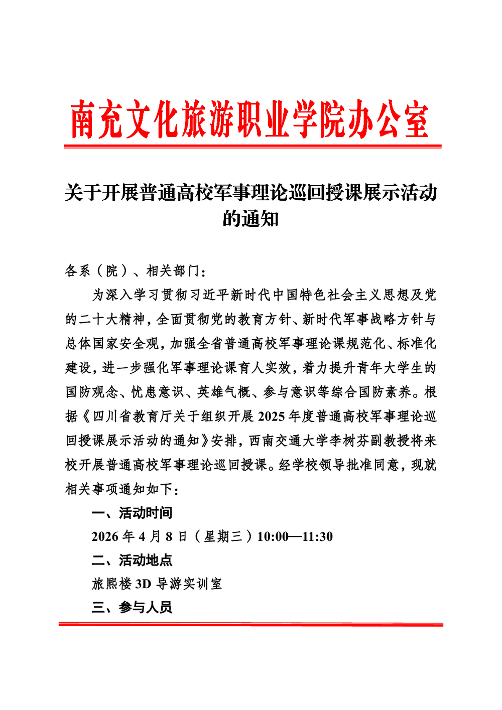 关于开展普通高校军事理论巡回授课展示活动的通知